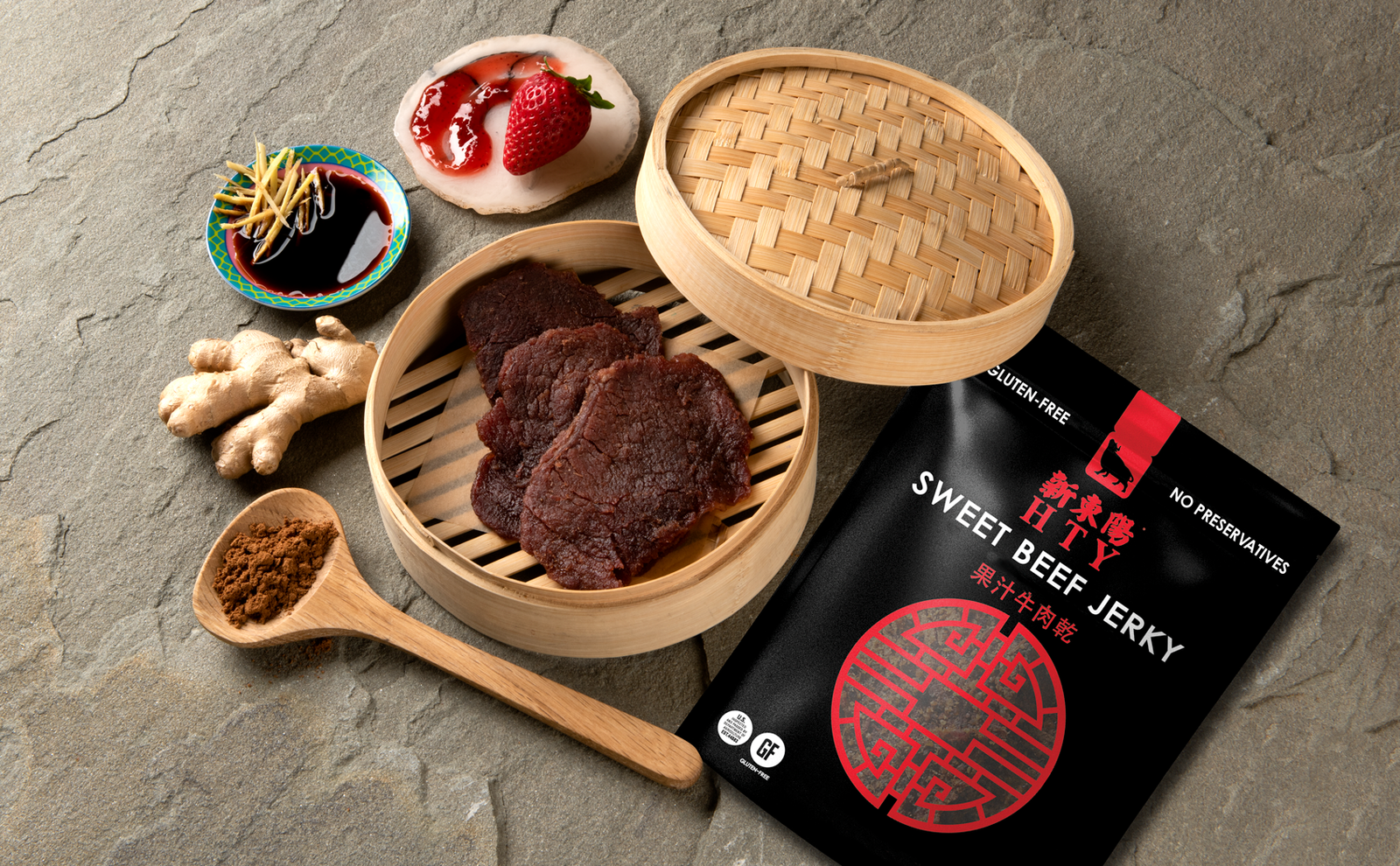Ingredients: Beef, Sugar, Strawberry Jam (Sugar, Strawberry Puree, Corn Syrup, Pectin, Citric Acid), Water, Gluten-Free Soy Sauce (Water, Soybeans, Salt, Sugar), Spices, Vegetable Oil, Celery Powder (cultured celery powder, sea salt), Salt.
